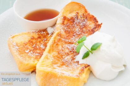Zum BetreuungsangebotViele Ihrer Gäste werden noch das Rezept „Arme Ritter“ kennen und Sie tatkräftig unterstützen. Peppen Sie das Rezept mit einem luftigen Sahnehäubchen auf. Die gemeinsame Zubereitung dieser himmlischen Geschmacksanregung bringt Freude, u…